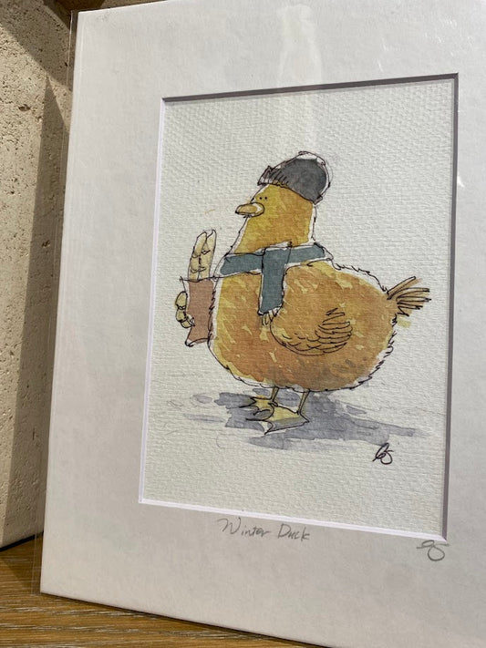 Winter Duck with a Baguette - Watercolor - Signed Prints